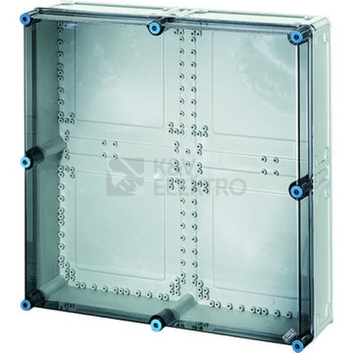 Skříně pro montáž kombinací energetických spínačů do 630 A nebo jako jednotlivé skříně. Z vysoce kvalitního polykarbonátu s ochrannou izolací. Stěnové průchodky s velkými otvory pro elektrické připojení skříní. Kabelové vstupy na všech stěnách skříní přes metrické předlisy nebo montážní příruby. Skříně pro upevnění na stěnu také pomocí vnějších patek nebo s montážními lištami. Prázdná skříň s průhledným víkem. Montážní rozměry š 575 mm x v 575 mm x h 150 mm. Pro montáž přístrojů na montážní desku nebo na nosnou lištu DIN. Max. vestavná hloubka při zabudované montážní desce 146 mm, při zabudované nosné liště 135 mm. Uzávěry víka otevíratelné pomocí nástroje.