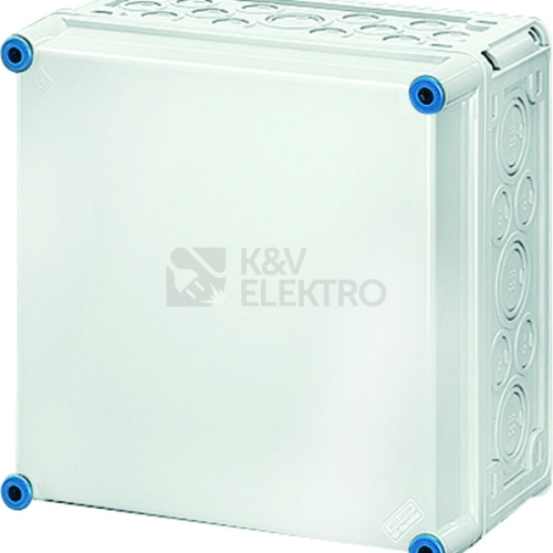 Skříně pro montáž kombinací energetických spínačů do 630 A nebo jako jednotlivé skříně. Z vysoce kvalitního polykarbonátu s ochrannou izolací. Stěnové průchodky s velkými otvory pro elektrické připojení skříní. Kabelové vstupy na všech stěnách skříní přes metrické předlisy nebo montážní příruby. Skříně pro upevnění na stěnu také pomocí vnějších patek nebo s montážními lištami. Prázdná skříň s neprůhledným víkem. Montážní rozměry š 275 x v 275 x h 150 mm. Pro montáž přístrojů na montážní desku nebo na nosnou lištu DIN. Max. vestavná hloubka při zabudované montážní desce 146 mm, při zabudované nosné liště 135 mm. Uzávěry víka otevíratelné pomocí nástroje.