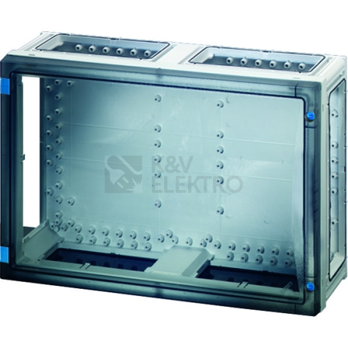 Skříň s dvířky pro montáž instalačních rozváděčů do 250 A pro ovládání běžnými osobami v souladu s normou IEC 61439-3. Otevřené stěny skříně pro kombinaci nebo jako samostatné skříně s krycími deskami. Z vysoce kvalitního polykarbonátu s ochrannou izolací. Rychlé spojení skříní pomocí konektorů a integrovaných těsnění. Stěnové průchodky s velkými otvory pro elektrické připojení skříní. Kabelové vývodky přes příruby. Upevnění na stěnu přímo na skříni pomocí vnějších úchytek nebo pomocí montážních lišt. Prázdná skříň s průhlednými dvířky a dveřním uzávěrem s ovládáním nástrojem. Pro montáž přístrojů na montážní desku nebo na nosnou lištu DIN. Montážní rozměry š 486 x v 306 x h 140 mm. Max. vestavná hloubka při zabudované montážní desce 136 mm, při zabudované nosné liště 125 mm. Plombovací sada pro plombování dveří se musí objednat samostatně.
