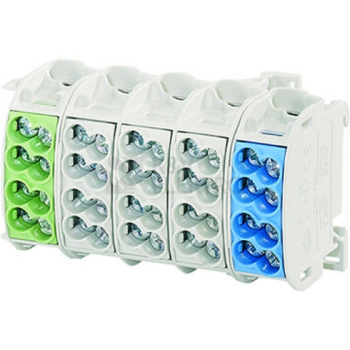 Odbočovací svorkovnice z hlavního vedení jako spojovací nebo podpěrná svorka, 1,5-25 mm², Cu. Pro montáž na DIN lištu.