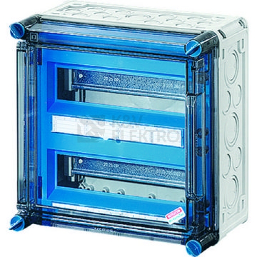 Skříně pro montáž kombinací energetických spínačů do 630 A nebo jako jednotlivé skříně. Z vysoce kvalitního polykarbonátu s ochrannou izolací. Stěnové průchodky s velkými otvory pro elektrické připojení skříní. Kabelové vstupy na všech stěnách skříní přes metrické předlisy nebo montážní příruby. Skříně pro upevnění na stěnu také pomocí vnějších patek nebo s montážními lištami. Jističová skříň s 24 modulovými jednotkami k zabudování řadových modulových přístrojů dle DIN 43 880. S PE a N svorkami pro měděné vodiče. N oddělitelný pro různé potenciály. S krycím páskem pro uzavření nevyužitých výřezů v krycí desce pro modulové přístroje a popisovými štítky pro identifikaci proudových obvodů. Průhledné závěsné víko, uzávěry víka pro ruční ovládání.