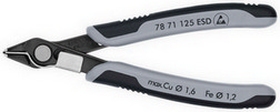 Precizní kleště pro nejjemnější stříhací práce např. v elektronice a jemné mechanice. Rukojeti elektricky svodivé - disipativní. Broušené, velmi tvrdé břity bez fasety. Střih nůžek s kontrolovaným mikro přesazením střižných hran pro mimořádně precizní střih i těch nejtenčích drátů a pro dlouhou životnost. Precizně tvarované hroty oddělí i sousední dráty od Ø 0,2 mm. Kloub s čepem z ušlechtilé oceli. Extrémně lehký chod pro snížení únavy při práci. S otevírací pružinou a omezením rozevření. S drátěnou svěrkou - žádné nekontrolované odskakování odstřižků drátů. Břity doplňkově induktivně tvrzené, tvrdost břitů asi 64 HRC kováno. Speciální nástrojová ocel, brunýrovaná.