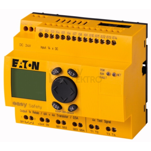 Rozšiřitelné bezpečnostní řídicí relé , jmenovité provozní napětí 24VDC, 14 bezpečných digitálních vstupů, 1 bezpečných a redundantních reléových výstupů 6 A, 4 tranzistorové výstupy 0.5A, 4 výstupy testovací signály, vhodné pro kat. 4 dle EN 954-1 / PL e dle EN ISO 13849-1 / SILCL3 dle IEC 62061 / SIL3 dle IEC61508, stupeň krytí IP20, žádná klávesnice, LCD displej, bezpečnostní a standardní funkce integrovány v jednom přístroji, systém sběrnice easyNet na desce, easyLink, rozšiřitelné o digitální vstupy a výstupy, rozšiřitelné k systémům sběrnic AS-Interface, PROFIBUS-DP, CANopen, deviceNet, individuální popis řídicího relé díky popisovacímu softwaru Labeleditor