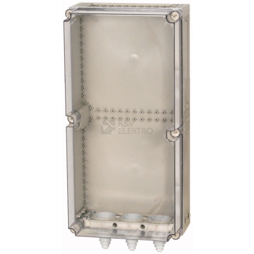 Skříňka s kabelovou přírubou s namontovaným kabelovým vývodem, material: Polykarbonát, odolná proti nárazům, stupeň krytí IP65, patentované upevňovací šrouby víka s integrovaným vyrovnáním přetlaku, bočnice uzavřené, vylamovací, stěny nahoře nebo dole otevřené, kabely lze vložit zepředu přes dělené kabelové spony, upevňovací šrouby s možností plombování, RAL 7032, štěrkově šedá (dolní část skříňky), průhledná, bezbarvá (víko), vestavná hloubka s montážním plechem=200 mm, provedení krytu: průhledné, provedení dolní části: nahoře otevřené, dole kabelové hrdlo