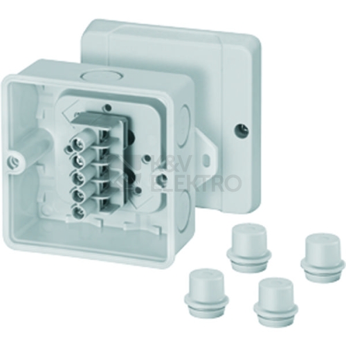 Kabelové rozvodky podle IEC 60670-22, s namontovanou spojovací svorkou a metrickými predlisy . Urceno pro vnitrní prostredí a chránené venkovní prostredí podle DIN VDE 0100, díl 737. pro teplotu prostredí max. + 40 °C a min. - 25 °C, pri relativní vlhkosti vzduchu 50% pri 40 °C nebo 100% pri 25 °C. Tepelná odolnost materiálu od - 25 °C do 70 °C, Odolnost proti požáru podle VDE 0471, díl 2 - Zkouška žhavou smyckou 750 °C, UL Subject 94 V-2. Krytí podle IEC 60529: IP 55 s nástrcnými kabelovými vývodkami, Typ ESM, IP 65 s kabelovými vývodkami, Typ AKM. Jmenovité izolacní napetí: 690 V, DIN VDE 0110. Materiál: Termoplast, bez halogenu a bez silikonu. Barva: šedá, RAL 7035. Upevnovací šrouby víka z nerezové oceli V2A. Výrobek: HENSEL DK. Jmenovitý prurez: 2,5 mm², 5pol. svorka