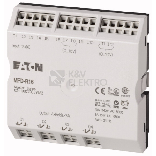 Modul I/O, napájecí zdroj 24VDC, zachycuje se na MFD-CP8/CP10, 12 digitálních vstupů, z toho 4 vstupy využitelné jako výstupy, 4 reléové výstupy
