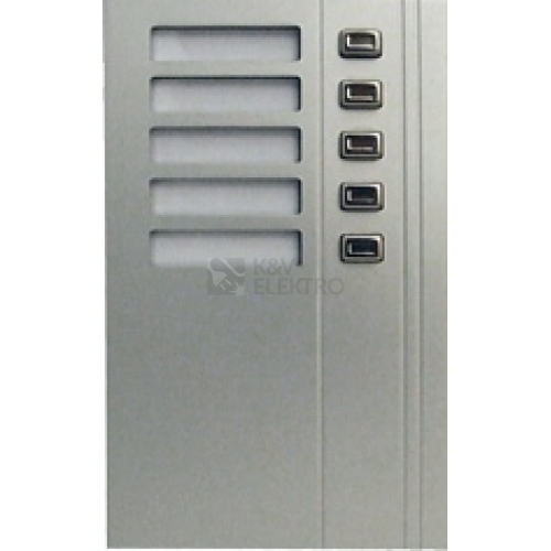 Tlačítkový modul je určen k vyzvonění domácího telefonu v dvojvodičovém systému. Můžeme jím nahradit poškozený modul v TT 2-BUS nebo ho použít pro vyskládání požadovaných tlačítkových tabel. Počet vyzváněcích tlačítek: 5 Počet tlačítek podsvícení: 0 Počet osvětlovacích LED diod: 3 Rozměry: 110 x 174 x 35 mm (v x š x h) Povrchová úprava: eloxovaný hliník