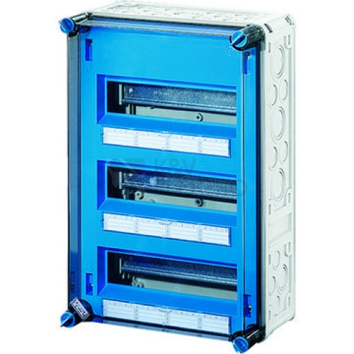 Skříně pro montáž kombinací energetických spínačů do 630 A nebo jako jednotlivé skříně. Z vysoce kvalitního polykarbonátu s ochrannou izolací. Stěnové průchodky s velkými otvory pro elektrické připojení skříní. Kabelové vstupy na všech stěnách skříní přes metrické předlisy nebo montážní příruby. Skříně pro upevnění na stěnu také pomocí vnějších patek nebo s montážními lištami. Jističová skříň s 36 modulovými jednotkami k zabudování řadových modulových přístrojů dle DIN 43 880. S PE a N svorkami pro měděné vodiče. N oddělitelný pro různé potenciály. S krycím páskem pro uzavření nevyužitých výřezů v krycí desce pro modulové přístroje a popisovými štítky pro identifikaci proudových obvodů. Průhledné víko, uzávěry víka pro ruční ovládání.