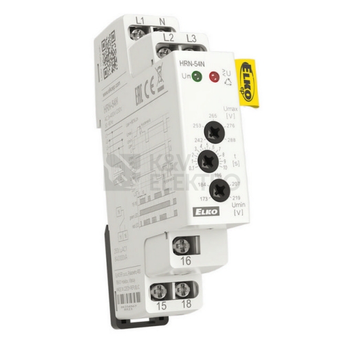 Používá se pro hlídání napětí, sledu a výpadku fází v rozvaděči (ochrana přístrojů a zařízení). POPIS Monitoruje velikost napětí ve 3-fázové soustavě a hlídá sled fází. Napájení přístroje se provádí z hlídaného napětí. Pevná prodleva T1 (500ms) a nastavitelná prodleva T2 (0.1 – 10 s) pro eliminaci krátkodobých výpadků a špiček. Pokud napájecí napětí poklesne pod 60 % Un (UOFF spodní úroveň) dojde k okamžitému rozepnutí relé bez uplatnění zpoždění. Možnost nastavení horní a dolní hranici napětí, při které kontakt výstupního relé vypne. Napěťové relé ve dvou provedeních: HRN-54: napájeno ze všech fází, tzn. že funkce relé je zachována i při výpadku jedné z fází HRN-54N: napájeno z L1-N, tzn. že relé hlídá i po přerušení nulového vodiče Chybový stav je indikován LED a rozepnutím výstupního kontaktu relé. TECHNICKÉ PARAMETRY napájecí a hlídané napětí HRN-54: 3 x 400 V HRN-54N: 3 x 400 V/ 230 V horní úroveň (Umax): 105 – 125% hlídaného napětí spodní úroveň (Umin): 75 – 95% hlídaného napětí výstupní kontakt: 1x přepínací 8 A/250 V AC1 (AgNi, 250 0 VA) v provedení 1-MODUL, upevnění na DIN lištu