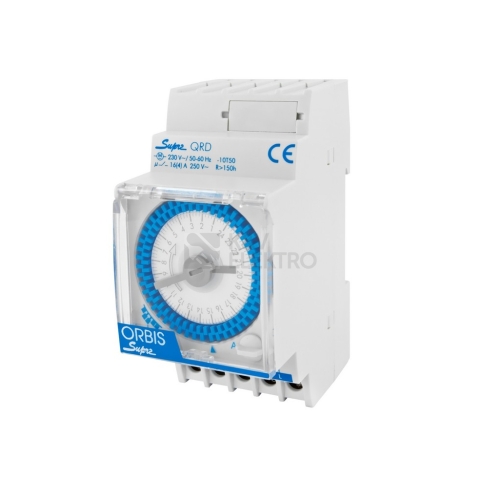Hodiny spínací SUPRA QRD, analogové, denní, šířka 44mm (2,5 mod.), 230V 50-60Hz, se zálohou chodu 100 hodin, na DIN lištu, krytí IP20