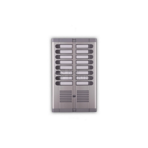 Tlačítkový panel s prostorem pro hlasovou jednotku řady 925 se 16 tlačítky ve 2 sloupcích. Včetně instalační krabice pod omítku. Panely jsou tvořeny poměrně silnou čelní deskou z eloxovaného hliníku, zakončenou na horní a dolní straně plastovými lištami. Pro osazení analogovými hlasovými jednotkami 1128/500 (4+n), 1128/510 (4+n), 1035/67 (1+n) a digitální jednotkou 1083/8 (2VOICE).