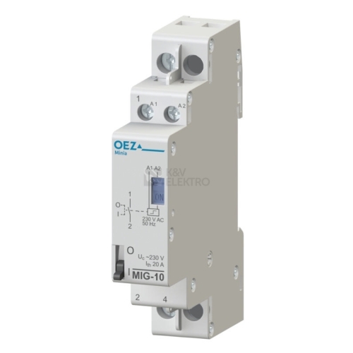 Impulzní relé OEZ MIG-20-10-230 Ke spínání elektrických obvodů impulzním povelem z více míst na chodbě, schodišti, celém domě apod. Především k ovládání světelných obvodů o vysokých výkonech Světelné obvody je možné ovládat tlačítky místo kombinace s křížovými a střídavými přepínači. Snižuje náklady na vodiče - pro ovládací obvod je možné použít vodiče o menším průřezu než pro silový obvod. Možnost manuálního spínání z čela přístroje (I-0). Páčka spínače zároveň indikuje stav kontaktů. Možnost trvalého manuálního vypnutí cívky relé z čela přístroje. Pokud je spínač v poloze OFF, nelze relé elektricky ovládat. Toho lze využít při údržbě apod. Vysoký počet kontaktů, provedení až se čtyřmi kontakty je dostatečné pro spínání většiny obvodů. Další zvýšení počtu kontaktů je možné provést instalací pomocného spínače PS-MIG-1100 na bok relé.