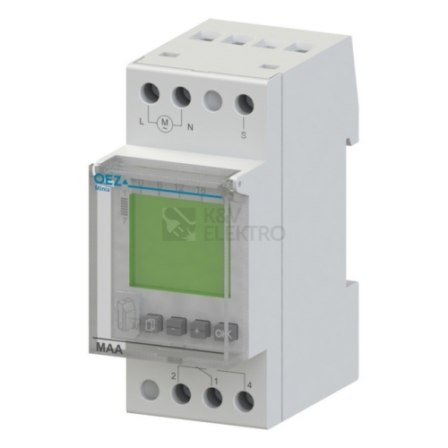 In 16 A, Uc AC 230 V, 2x přepínací kontakt, týdenní program, 2 kanály, funkce astro, jazyk CS, EN, DE, PL, RU, IT, FR, ES, PT, NL, DA, FI, NO, SV, TR, záloha chodu