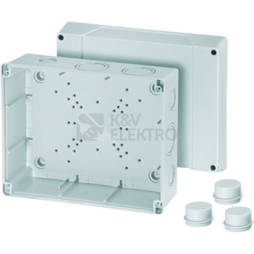 Kabelové rozvodky podle IEC 60670-22, s metrickými predlisy. Urceno pro vnitrní prostredí a chránené venkovní prostredí podle DIN VDE 0100, díl 737. pro teplotu prostredí max. + 40 °C a min. - 25 °C, pri relativní vlhkosti vzduchu 50% pri 40 °C nebo 100% pri 25 °C. Tepelná odolnost materiálu od - 25 °C do 70 °C, Odolnost proti požáru podle VDE 0471, díl 2 - Zkouška žhavou smyckou 750 °C, UL Subject 94 V-2. Krytí podle IEC 60529: IP 55 s nástrcnými kabelovými vývodkami, IP 65 s kabelovými vývodkami, Typ AKM. Materiál: Termoplast, bez halogenu a bez silikonu. Barva: šedá, RAL 7035. Upevnovací šrouby víka z nerezové oceli V2A. Výrobek: HENSEL DK. Jmenovitý prurez: 35 mm²