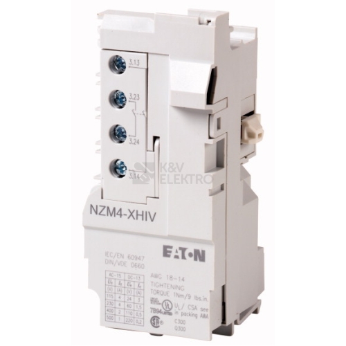 Volitelné příslušenství k řadě výkonových spínačů NZM nabízí bohaté portfolio možností využití při nasazení na celém světě. Montáž je vždy pružná a jednoduchá díky modulárním funkčním skupinám. Upozornění: Pro blokovací obvody a obvody ke snížení zátěže a také k předbíhajícímu připojování podpěťové spouště při použití s hlavním vypínačem/nouzovým vypínáním. Nepoužívejte ve spojení s podpěťovou spouští NZM..-XU.., vypínací spoušť NZM..-XA.. nebo dálkový pohon NZM..-XR.. Předstih při sepnutí (ruční ovládání): cca 20..90 ms. Lze použít pro: NZM4(-4), N(S)4(-4)