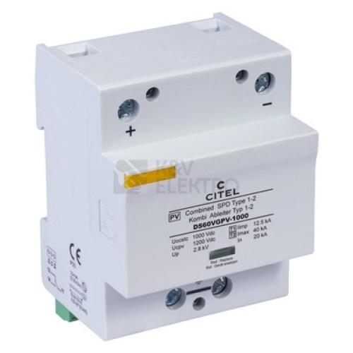 Svodič bleskových proudů a přepětí řady DS 60VGPV je svodič impulsních (bleskových) proudů. Byl speciálně vyvinut pro ochranu fotovoltaických zařízení a je k dispozici pro provozní napětí 500 a 1000 V DC. Svodič DS 60VGPV je kombinovaný svodič typu 1 a 2 v provedení jako monoblok s impulsním bleskovým proudem 12,5 kA na pól (vlna 10/350 µs), který představuje bezpečnou ochranu proti blízkým i přímým úderům blesku Svodič obsahuje osvědčenou ochranu typu VG se speciálním plynem plněným jiskřištěm (GSG) a vysokovýkonné varistory v zapojení do Y. Speciální vývoj a zapojení jednotlivých komponent umožňuje bezchybné měření izolačního odporu a výrazně prodlužuje životnost svodiče, neboť nevznikají žádné propustné ani provozní proudy. Svodič DS60VGPV je standardně vybaven dálkovou signalizací stavu ochrany. Díky galvanickému oddělení je svodič DS60VGPV vhodný i pro aplikace s fotovoltaickými panely na bázi tenkých vrstev. Kombinovaný svodič přepětí typu 1+2 na bázi plynem plněného jiskřiště. 10-letá záruka Impulsní svodový proud na pól: Iimp=12,5kA (10/350 µs) Dvojnásobně jištěné odpojovací zařízení Galvanické oddělení Nedochází ke stárnutí v důsledku propustných nebo provozních proudů Zapojení do Y odolné proti chybám a přepólování Není nutné předjištění Dálková signalizace stavu standardně Lze použít do všech fotovoltaických zařízení až do 1000 V DC (Uocstc) Splňuje požadavky norem IEC 61643-1 a EN 61643-11 Splňuje požadavky normy VDE 0185-305 díl 3 / příloha 5, ochrana proti blesku u fotovoltaických zařízení