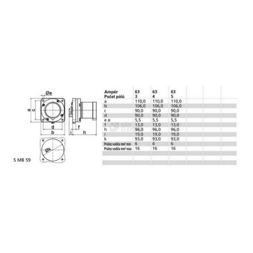 CEE přívodka vestavná přímá63A 4p (3P+PE) 400V (380 do 415V~) 6h IP44 frekvence: 50 a 60Hz kód barvy: červená RAL 3000 kontakty: nosič kontaktů je vyroben z materiálu odolného vůči vysokým teplotám, kontakty jsou vyrobeny z mosazi, povrch kontaktů je poniklovaný maximální průřez vodiče: 16,0 mm2materiál krytu: polyamid způsob připojení: šroubová rámová svorka barva: límec červený, kryt šedý rozměry: výška 105 mm, šířka 100 mm, hloubka 114 mm rozměr příruby: svisle 110 mm, vodorovně 106 mm rozteč montážních otvorů: vodorovně 90 mm, svisle 90 mm další technické vlastnosti:instalační otvor je ve středu příruby