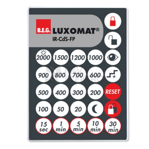 Infračervené dálkové ovládání pro pohodlné nastavení nebo změnu parametrů. Kompletní s nástěnným držákem. Jednoduché naprogramování CdS-DE fotoelektrického spínače. Rozměry : 80 x 60 x 8 mm(in translation) zatažený/tmavý max. 5 až 6 m sluneční svit max. 2 až 3 mAccu: lithium 3,0 VVýrobce: B.E.G. Brück Electronic GmbHBarva: -Výr. číslo: 92396Typ: IR-CdS-FP