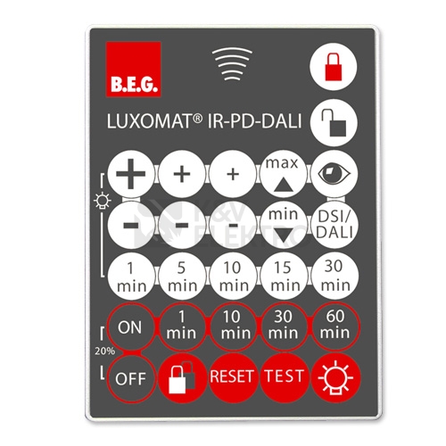 Infračervené dálkové ovládání pro pohodlné nastavení nebo změnu parametrů. Kompletní s nástěnným držákem. Jednoduché naprogramování pohybových detektorů PD2-M-DALI/DSI, PD4-MDALI/DSI /-K, PD9-M-DALI/DSI /-GH a PD4-M-DUO-DALI.Rozměry : 80 x 60 x 8 mm(in translation) zatažený/tmavý max. 5 až 6 m sluneční svit max. 2 až 3 mAccu: lithium 3,0 VVýrobce: B.E.G. Brück Electronic GmbHBarva: -Výr. číslo: 92094Typ: IR-PD-DALI