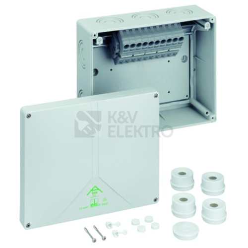 Spojovací krabice, se stupněm krytí IP54/IP65, Jmenovitý průřez 16mm², Ui=690V AC, Certifikováno podle VDE (DIN EN 60670-1/-22 (VDE 0606-1/-22)), Vyrážecí membrány, M20/M25/M32/M40/M50, (4 ze zadu, 10 z boku), Vnitřní místa pro připevnění, s bezšroubovými svorkami pro standardní instalace ve vnitřním prostoru, šedá, s vysoko položenou bezšroubovou svorkou Wago 2016-1201, 5-pólovou, max. jmenovitý průřez podle DIN EN 60998: 16mm², při proudové zatížitelnosti 76 A, svorkovatelné průřezy na pól: 4 x 0,5 až 16mm², pevné, 4 x 0,5 až 25mm² flexibilní, Rozměry: 250 x 200 x 115mm, Přiložené příslušenství: 4 Vývodka IP54 M40 Rozsah těsnění 17-30mm, 1 Zaslepovací zátky M40, 1 Plombovací souprava
