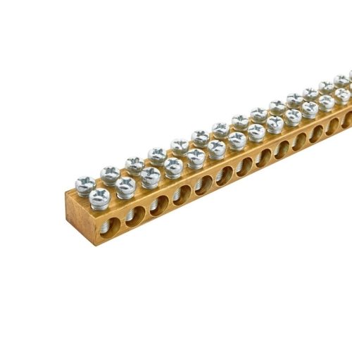 Svorkovnice N/PE mosazná NSCH 15x10x1000mm, krytí IP00, 111 připojných míst, pro průřez od 1,5 mm2 až do 25mm2, dvouřadá, jmenovitý proud 125A, jmenovité napětí 230/400V.