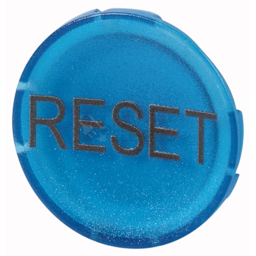 Modrý, plochý, popsaný seznam tlačítek programu RMQ-Titan 22 mm k použití s prosvětlenými ovládacími hlavicemi tlačítek s prvky LED, které jsou zapojeny za nimi. Modré světelné čočky lze volitelně osvětlit bílými nebo modrými LED prvky.
