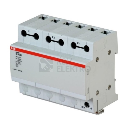 Iimp = 25 kA(10/350), typ 1/třída B, pólů: 3, ochranná napěťová úroveň Up = 2,5 kV, jmenovité napětí Un = 230 V, max. trvalé provozní napětí Uc = 255V, Ifi=50 kA