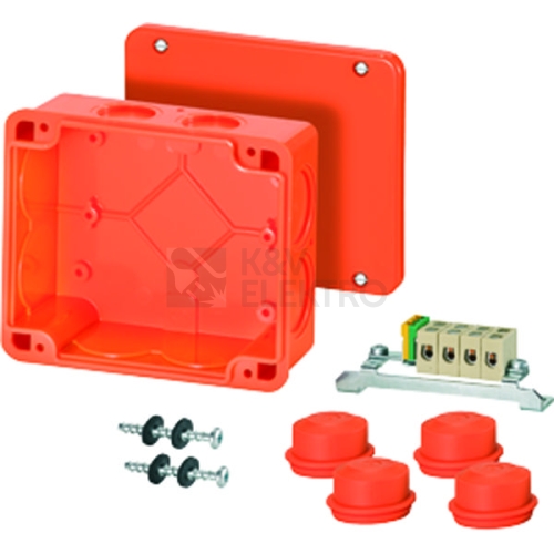 Kabelové krabicové rozvodky dle IEC 60670-22, s pevne vestavenou spojovací svorkou, 5pól. Testováno na zachování funkcnosti dle DIN 4102 cást 12 ve spojení s kabely pro zachování funkcnosti firem: Dätwyler, Eupen, Nexans, Prysmian a Studer dle osvedcení o zkoušce. Zachování funkcnosti (30 minut, trída E 30 nebo 90 minut, trída E 90). S upevneními schválenými pro požární ochranu. Vhodný do vnitrních prostor a pro chránenou instalaci ve venkovním prostoru podle DIN VDE 0100, cást 737. Krytí dle IEC 60529: IP 65, s montovanými nástrcnými kabelovými hrdly, zavrené. Jmenovité izolacní napetí: 400 V, DIN VDE 0110. Materiál: Duroplast Barva: RAL 2003, pastelove oranžový. Výrobek: HENSEL FK. Jmenovitý prurez: odbocka 1,5 až 4 mm², spojení 1,5 až 10 mm², 5pólová svorka