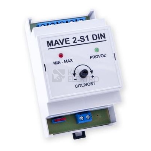 Snímač hladiny MAVE 2-S1 DIN Použití: Limitní snímání jedné havarijní hladiny (min/max). Popis: Pro připojení jedné vodivostní sondy MAVE. Možnost nastavení vstupní citlivosti snímání pro aplikace, kde se používá upravená voda. Technické údaje Napájecí napětí: 230 V AC / 50-60 Hz Příkon: max. 3 VA Výstup: přepínací kontakt relé Zatížení kontaktů relé: max. 250 V / 5 A Napětí / proud na sondě: 12 V AC / 0,6 mA Vstupní citlivost: 5-100 kOhm Signalizace: LED zelená - napájecí napětí LED červená - výstup (sepnuté relé)