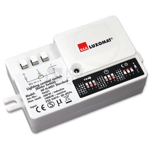 Vysokofrekvenční pohybový detektor, obzvláště pro zapuštěnou montáž a montáž do svítidelDetekce v závislosti na teplotěMožná detektce pohybu přes zdi a jiné překážkyDosah, hodnota soumraku a časování jsou nastavitelné přes DIP spínačeTypical applications: installation in light fittings, dry lining boxes or behind wall or ceiling coverings with sufficient light detection for the light sensorNapětí : 230 V AC +/- 10% 50 HzRozměry : 103 x 53 x 26 mmSpotřeba elektrické energie : ca. 0,8 WDetekčním rozsahem : vertikální 360°Dosah : Ø 0,2 – 16 mVelikost snímaného prostoru pro nepřímý pohyb, v případě montáže v doporučené výšce : 200 m² / 2,5 m montážní výška(in translation): 1 m / 11 m / 2,5 mStupeň krytí : IP20 / třída IIOkolní teplota : -35 °C až +70 °CBydlení : obal UV a nárazuvzdorný polykarbonát kanál 1 (ovládání osvětlení)Spínací kapacita : 1000 W, cos φ = 1Typ kontaktu : 1x µ kontakt, bez kontaktuČas dobehu : 5 s – 25 minPrahová hodnota sepnuti : 2 – 30 luxRadarová/ HF technologie: 5,8 GHz, <10 mWVýrobce: B.E.G. Brück Electronic GmbHBarva: bílá mat, podobný RAL9010Výr. číslo: 94431Typ: HF-H-MD1 Standard