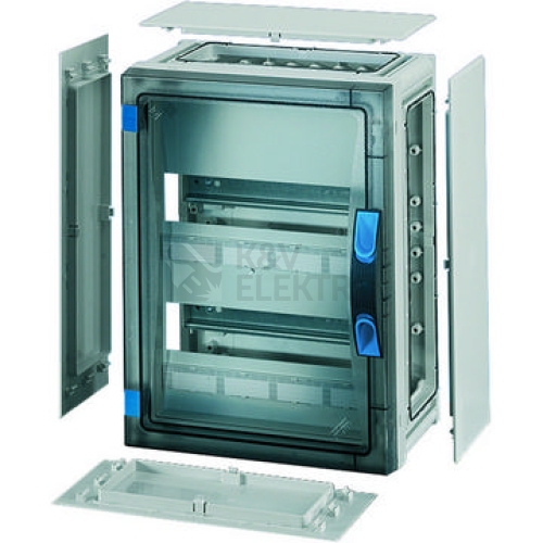 Skříň s dvířky pro montáž instalačních rozváděčů do 250 A pro ovládání běžnými osobami v souladu s normou IEC 61439-3. Otevřené stěny skříně pro kombinaci nebo jako samostatné skříně s krycími deskami. Z vysoce kvalitního polykarbonátu s ochrannou izolací. Rychlé spojení skříní pomocí konektorů a integrovaných těsnění. Stěnové průchodky s velkými otvory pro elektrické připojení skříní. Kabelové vývodky přes příruby. Upevnění na stěnu přímo na skříni pomocí vnějších úchytek nebo pomocí montážních lišt. Jističová skříň s 24 modulovými jednotkami k zabudování řadových modulových přístrojů dle DIN 43 880. S PE a N svorkami pro měděné vodiče. N oddělitelný pro různé potenciály. S krycím páskem pro uzavření nevyužitých výřezů v krycí desce pro modulové přístroje a popisovými štítky pro identifikaci proudových obvodů. Průhledná dvířka a plombovatelný dveřní uzávěr s ručním ovládáním. Se sadou krycích desek.