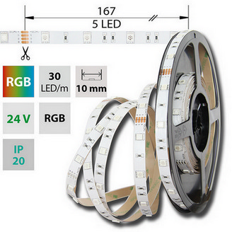 LED pásek SMD5050, RGB - barevný, 7,2W, 30LED, segment 167mm, 5LED/segment, IP20, DC 24V, životnost 35000h, šíře 10mm, bílý PCB pásek, max. délka pásku při jednostranném zapojení: 7m, opatřen samolepící páskou 3M.