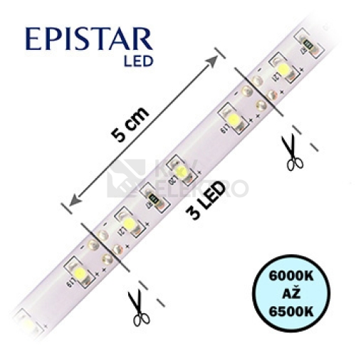 Flexibilní pásek s LED SMD diodami, efektivně vyzařujícími světlo, je vhodný pro dekorativní nasvícení interiérů, náročné osvětlovací systémy, ale i pro reklamní účely. Velkou předností je velká svítivost a napájení malým napětím 12 V DC (příp. 24 V DC, dle typu) a snadné ovládání pomocí volitelných spínačů, stmívačů či ovladačů. Díky sério-paralelnímu zapojení lze pásek jednoduše dělit po jednotlivých modulech. Pro snadnou montáž je jedna strana pásku opatřena oboustrannou lepící páskou firmy 3M.Technické parametry: Příkon (W): 12.5 Světelný tok (lm): 1200 Barevná teplota: 6000 - 6500 K Počet LED/m: 60 LED/m Typ LED čipu: 2835 Výrobce LED čipu: Epistar Vyzařovací úhel: 120° Index podání barev: Ra > 94 Krytí: IP65 Pracovní teplota: -25 °C až +50 °C Napájecí napětí: 12 V DC Počet LED / Délka modulu: 3 LED / 5 cm Rozměry: 10 x 3 mm Balení: 20 m