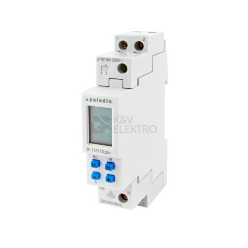 Hodiny spínací PALADIN 172113pro, digitální, 1kanál, 1modul, se zálohou, šedé, na DIN, Astronomické, týdenní program, 60 úložných míst