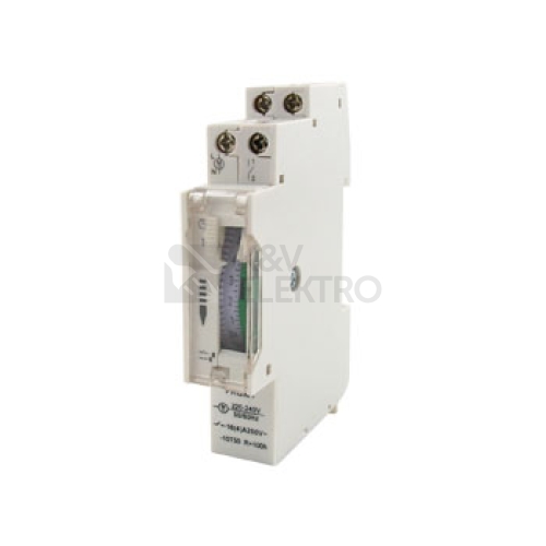 Jednoduché mechanické spínací hodiny s 24hodinovým cyklem vhodné pro umístění do rozvaděčů na DIN lištu.Technické parametry: Provozní napětí: 230 V / 50 Hz Max. spínaný příkon: 3500 W (1500 W) Max. spínaný proud: 16 A (4 A) Nejkratší spínaná doba: 15 minut Nejdelší spínaná doba: 24 hodin Záloha chodu: až 100 hod. (NiMh akumulátor) Krytí: IP 20 Provozní teplota: - 25 až + 50 °C