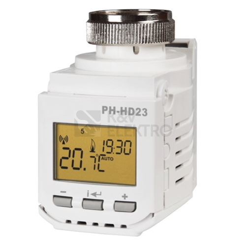 Vlastnosti bezdrátové digitální hlavice PH-HD23: Je prvek ovládající ventil na radiátorovém topení. Hlavice může pracovat autonomně (podle vnitřního, Vámi nastaveného programu) nebo v bezdrátovém režimu, kdy je řízena centrální jednotkou. Hlavice snímá aktuální teplotu interním čidlem a podle rozdílu s požadovanou teplotou přivírá nebo otvírá ventil. Informace o pozici ventilu, dané teplotě a stavu napájecích baterií předává centrální jednotce. Funkce PH-HD23: VELKÝ PODSVÍCENÝ DISPLEJ automatická adaptace po připojení na ventil indikace otevření ventilu v % možnost krátkodobé změny teploty konstanta korekce referenčního bodu možnost obrácené komunikace pro rychlejší odezvy letní režim servisní režim nezávislý režim funkce BOOST automatická ochrana před vodním kamenem konektor pro externí napájení protizámrazová ochrana indikace výměny baterií dětská pojistka-zámek kláves možnost připojení externího čidla teploty