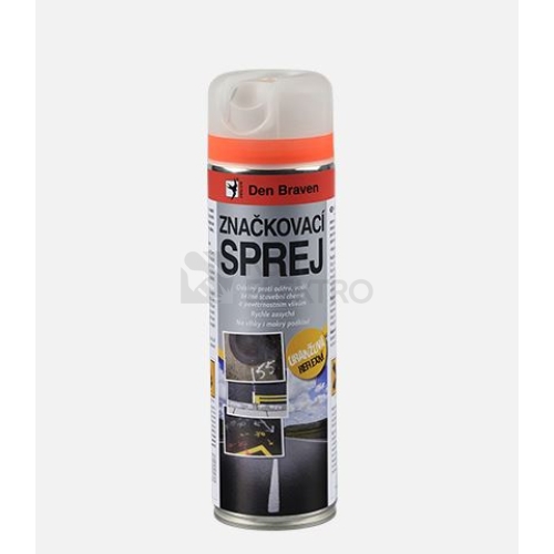 Značkovací sprej Den Braven je speciální nástřiková barva pro značení všeho druhu jako například vedení inženýrských sítí, vytyčování pro zemní práce, značení napadených stromů a mnoho dalších. Sytá a velmi jasná neprůsvitná barva vhodná na dřevo, kov, beton, asfalt, kámen, zeminu aj. Odolná proti oděru, vodě, běžné stavební chemii a povětrnostním vlivům. Lze aplikovat na vlhký i mokrý podklad. Před upotřebením protřepejte. Stříkejte ze vzdálenosti cca 20 cm. Dóza je multipoziční, lze ji držet při aplikaci dnem dolů i vzhůru. Používat při okolní teplotě vzduchu do 40°C. V závislosti na hustotě provozu je barva dobře čitelná cca 3-4 týdny. Po uplynutí této doby se začne z podkladu vytrácet. Pokud byla barva aplikována na mokrý podklad, je tato doba kratší.
