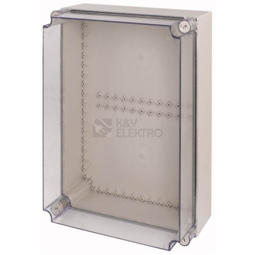 Skříňka s průhledným víkem, material: Polykarbonát, odolná proti nárazům, stupeň krytí IP65, volitelně uzamykatelná s DVZ...-CI, pat entované upevňovací šrouby víka s integrovaným vyrovnáním přetlaku, bočnice hladké, bez vylamovacích otvorů, upevňovací oka k upevnění na stěnu, upevňovací šrouby s možností plombování, RAL 7032, štěrkově šedá (dolní část skříňky), průhledná, bezbarvá (víko), vestavná hloubka s montážním plechem=200 mm, provedení krytu: průhledné, provedení dolní části: hladké