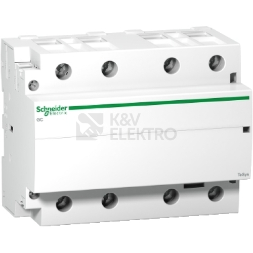 TeSys GC modulární stykač, 4P (4Z), 100A/415V AC-7a (topení), pro použití v domácnosti. Ovl. napětí 220-240 V AC 50 Hz, státní ukazatel na čele. Pro použití v modulárních panelech, kompaktní (šířka 108 mm), nacvakávací na 35 mm DIN liště, připojení šroubovými svorkami. Prodává se v dlouhé řadě 2 jednotek. Certifikováno více standardů (IEC, ENF, NF-USE, VDE, CEBEC, OVE), Green Premium (RoHS/REACh).