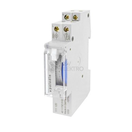 Hodiny spínací PALADIN 111120, analogové, denní, šířka 17,5mm (1 mod.), 230V 50-60Hz, bez zálohy chodu, šedé, na DIN lištu, krytí IP20