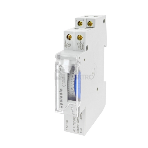 Hodiny spínací PALADIN 114120, analogové, denní, šířka 17,5mm (1 mod.), 230V 50-60Hz, se zálohou chodu, šedé, na DIN lištu, krytí IP20