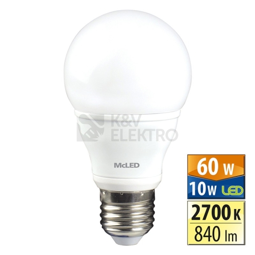 Žárovka LED McLED s výkonem 10W a šroubovací paticí E27 může být plnohodnotnou náhradou za klasickou 60W žárovku. Barva světla, které vyzařuje je teplá bílá a je vhodná pro odpočinek a do místností, kde trávíte mnoho času.