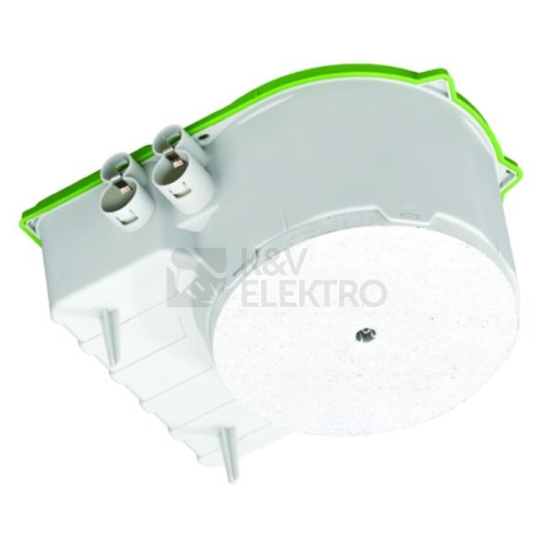 Skříně, pro prefabrikáty, pro montáž svítidel NV/HV/LED a reproduktorů, pro instalaci svítidel otestovaných VDE podle DIN EN 60598 (VDE 0711), a rovněž s označením F nebo označením MM, maximální vestavná výška svítidel NV: 105mm, svítidla HV: 110mm, příkon lampy max. 50 W / LED 25 W, s dodatečným propojovacím prostorem (např. k montáži elektronického bezpečnostního transformátoru do max. 150 VA), se stupněm krytí IPX4, dimenzované izolační napětí: 400V AC, bez obsahu halogenů, Otvor výstupu: Deska Fermacell(R), variabilní do max. průměr 150mm, 8 kombinovaných trubkových přívodů 4 x M20, 4 x M25, integrovaná zarážka pro trubky a odlehčení tahu pro trubky M20, M25, Upevnění lepením nebo hřebíky, integrované trubkové hrdlo, Rozsah těsnění M20-M25, Rozměry: 255 x 280 x 130mm