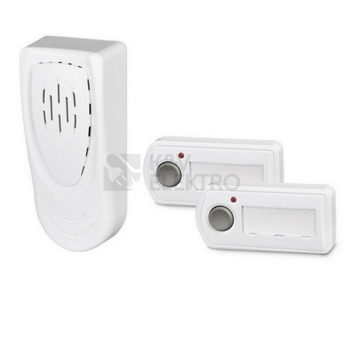 Napájení 2 bateriex1,5V R6/AA. spotřeba přijímače v klidu < 0,3mA Zvuk - gong. Dosah 80 m na volné ploše. Dosah až 25m v zástavbě. Sada obsahuje 2 vysílače, každý vyvolá jiný zvuk.
