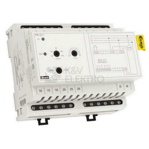 Nastavitelná úroveň proudu v % In. Pevná úroveň diference. Relé se používá pro hlídání proudu v třífázových zařízeních (například jeřáby, motory, apod.). POPIS 2 funkce: a) UNDER – hlídá pokles velikosti proudu pod nastavenou hodnotou I. b) OVER – překročení nastavené hodnoty I. Nastavitelná úroveň zpoždění (při překročení nastavené meze). Možnost připojení i přes proudové transformátory pro zvětšení hodnoty hlídaného proudu až na 600 A. TECHNICKÉ PARAMETRY napájecí napětí AC/DC 24 – 240 V, galvanicky odděleno od obvodu hlídaného proudu dle jmenovitého proudu In se dělí na 2 typy: PRI-53/1 – AC 1 A PRI-53/5 – AC 5 A výstupní kontakt: 2x přepínací 8 A (AgNi, zlacený) v provedení 6-MODUL, upevnění na DIN lištu
