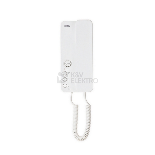 Domovní telefon MIRO se sluchátkem pro digitální systém 2VOICE (1083).Vlastnosti:- Montáž na stěnu.- Bílý lesklý ABS plast.- Rozlišené zvonění od tabla a z podlaží.- Funkce MUTE (vypnutí vyzvánění).- Tlačítko pro ovl. el. zámku a další 3 servisní tlačítka (ovládání vrat, osvětlení, volání na ústřednu, atd.).- LED signalizující zvonění a další funkce (např. otevřené dveře).- Servisní tlačítka se při zvednutém sluchátku dají použít i ke zvonění na jiné stanice.- Navrženo k osazení na kulatou montážní krabici průměru 60 mm.- Programování pomocí DIP přepínačů.