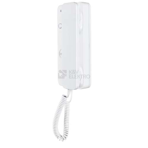 Domovní telefon URMET 1150/35 pro analogové systémy 1+n Technické parametry domácího telefonu: Montáž na stěnu Bílý lesklý ABS plast Tlačítko pro otevření elektrického zámku a další servisní tlačítko (ovládání vrat, osvětlení, atd.) Navrženo k osazení na kulatou montážní krabici průměru 60 mm Sluchátko připevněno k telefonu krouceným kabelem Elektronické vyzvánění