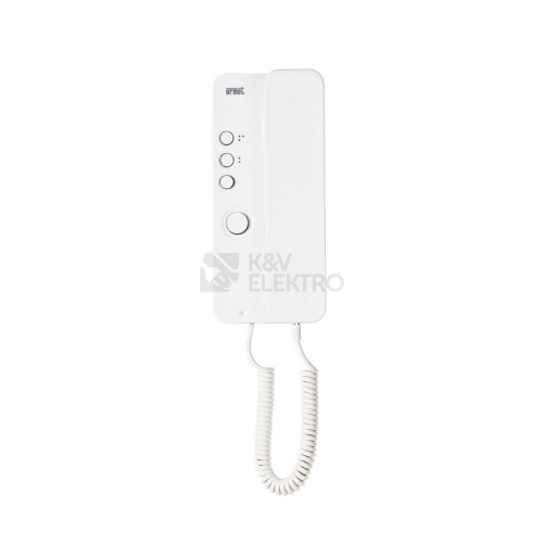 Domovní telefon MIRO 1150/351 s tlačítkem pro otevírání elektrického zámku. Do analogového systému 1+n. Vlastnosti:- Montáž na stěnu.- Bílý lesklý ABS plast.- Nastavení hlasitosti vyzvánění, funkce MUTE (vypnutí vyzvánění).- Tlačítko pro ovládání elektrického zámku.- Navrženo k osazení na kulatou montážní krabici průměru 60 mm.- Sluchátko připevněno k telefonu krouceným kabelem.- Elektronické vyzvánění.