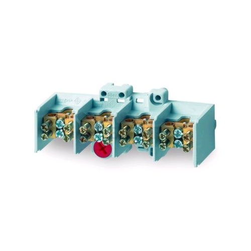 Hlavní odbočovací svorkovnice do 25 mm2 jmenovitý průřez 25 mm2, 400 V univerzální rychloupínání vodorovně i svisle na montážní lištu 35 mm (DIN) izolační těleso z polyamidu s vysokou odolností proti plazivým proudům, barva šedá RAL 7035 kontakty z MS 58, upevňovací šrouby z oceli, galvanicky zinkované shlavou „Pozidrive – kombinovaná drážka“ Vstupní svorka: 2 x 25 mm2 2 odbočky 16 mm2 na pól 4 póly