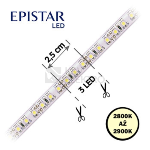 Flexibilní pásek s LED SMD diodami, efektivně vyzařujícími světlo, je vhodný pro dekorativní nasvícení interiérů, náročné osvětlovací systémy, ale i pro reklamní účely. Velkou předností je velká svítivost a napájení malým napětím 12 V DC (příp. 24 V DC, dle typu) a snadné ovládání pomocí volitelných ovladačů, kontrolérů a stmívačů. Díky sério-paralelnímu zapojení lze pásek jednoduše dělit po jednotlivých modulech. Pro snadnou montáž je jedna strana pásku opatřena oboustrannou lepící páskou firmy 3M.Technické parametry: Příkon (max.): 9,6 W/m Světelný tok: 660 lm/m Barevná teplota: 2800 - 2900 K Počet LED/m: 120 LED/m Typ LED čipu: 3528 Výrobce LED čipu: Epistar Vyzařovací úhel: 120° Index podání barev: Ra > 80 Krytí: IP20 Pracovní teplota: -25 °C až +50 °C Napájecí napětí: 12 V DC Počet LED / Délka modulu: 3 LED / 2,5 cm Rozměry: 10 x 2,4 mm Balení: 20 m